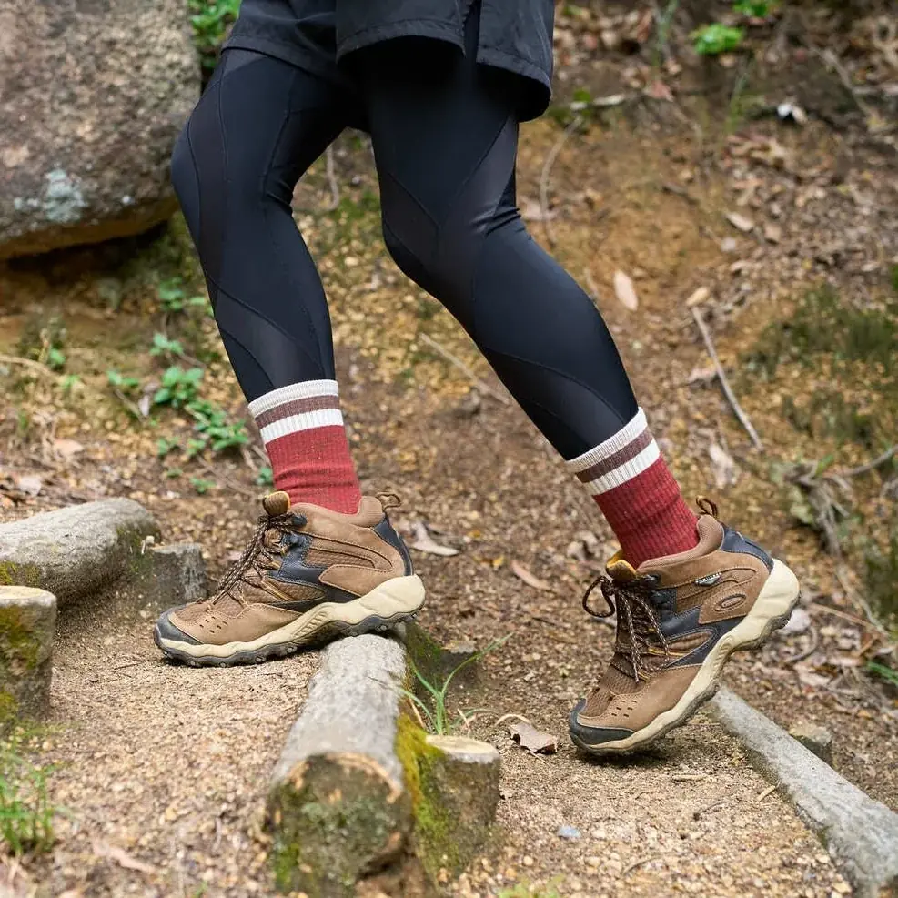 天然素材の風合いを大切にしつつも、アウトドアシーンで安心して使用できるように、化学繊維の力も取り入れています。速乾性と強度を高めるポリエステルやナイロン、しなやかなフィット感を生むポリウレタンをバランス良く配合し、岩場や木の根っこが多い道でもためらわずに使える頼もしい一足となっています。 - 自然に溶け込むカラーと、選べる2サイズ
