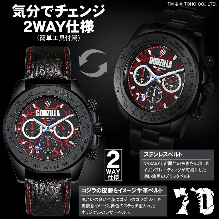 この電波ソーラークロノグラフは、ブラックボディに地割れをイメージした赤いラインが施されており、ゴジラの口から吐き出される放射熱線をイメージした青い秒針が特徴的です。さらに、チェンジベルトはゴジラの皮膚をイメージしたレザーベルトが採用されており、2WAY仕様で気分に合わせて付け替えることができます。