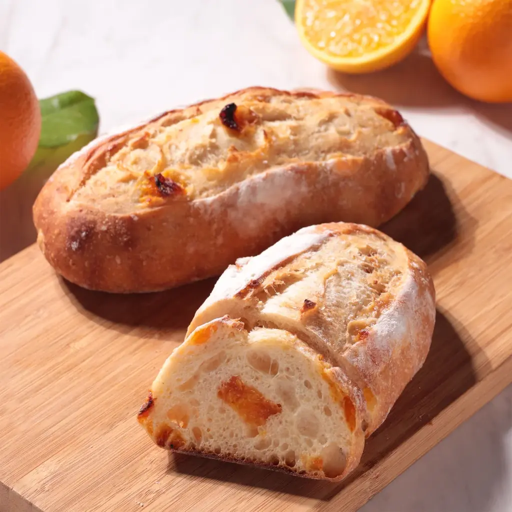 「オレンジのルヴァン」は、パン・オ・ルヴァンに白ワインで風味付けしたドライオレンジを合わせて焼き上げた商品です。しっかりとした食感とオレンジの風味が楽しめる一品です。
