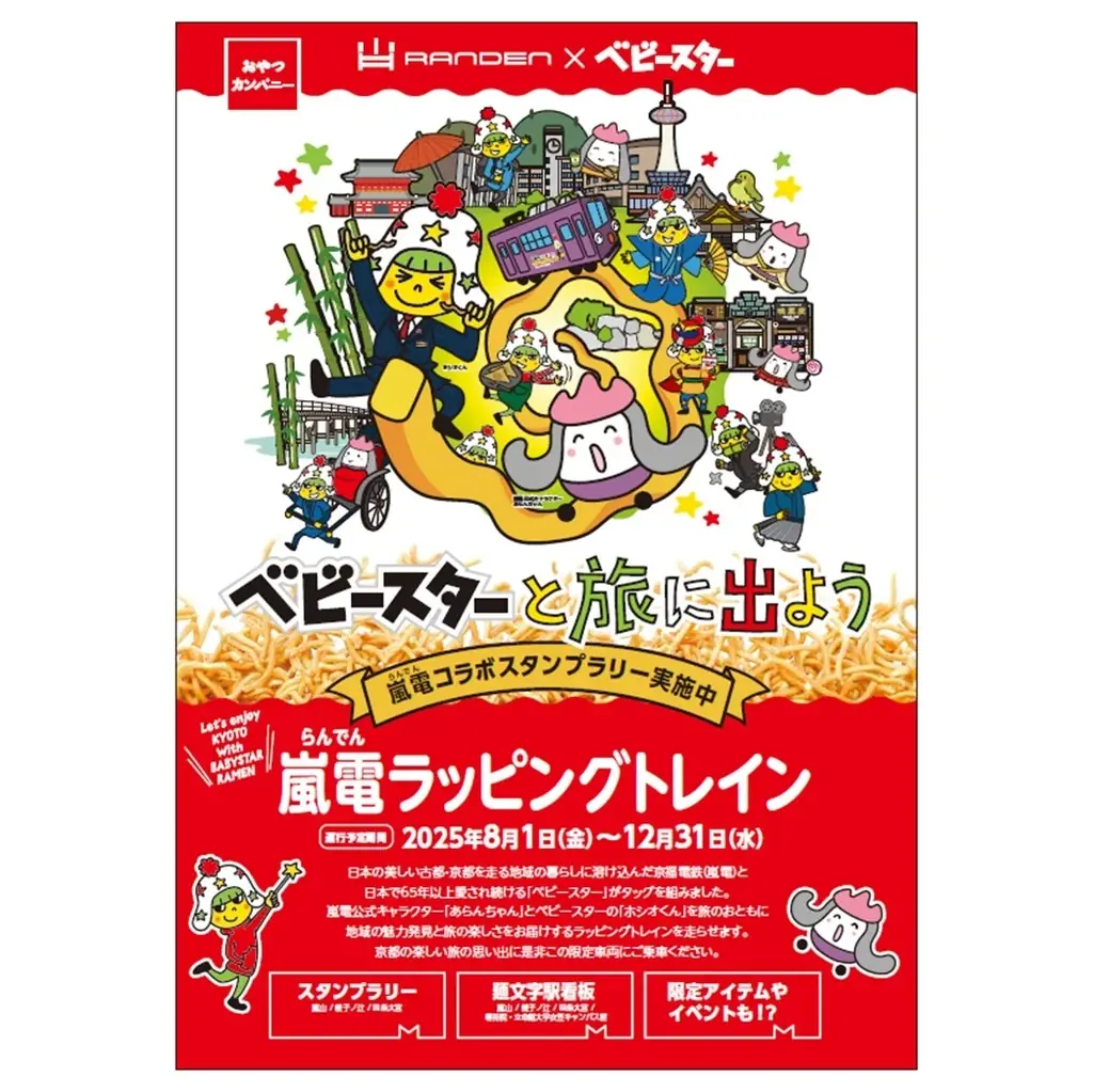 2025年8月1日から12月31日まで、京福電鉄の嵐電とコラボしたラッピングトレインが運行されます。駅名看板にはベビースターを使った麺文字が使用され、京都の魅力を発見する旅を演出します。