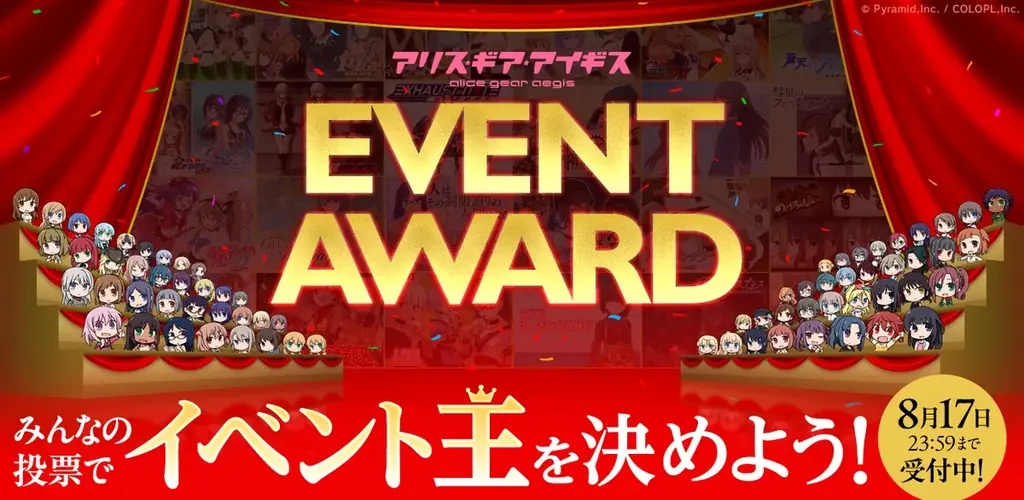 さらに、「アリス・ギア・アイギス」の様々なイベントの中から各部門ごとのイベント王を決定する「アリスギア EVENT AWARD」も開催中です。このイベントに投票することで、抽選で各部門ごとのイベントピンバッチセットが当たるキャンペーンも実施されています。