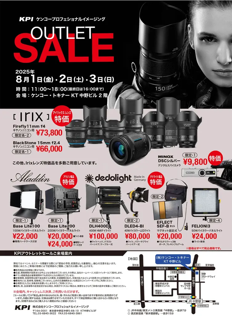 さらに、2025年8月1日(金)から3日(日)にかけて、ケンコー・トキナーの関連会社である株式会社ケンコープロフェショナルイメージングが、KT中野ビルの2階サービスショップにてアウトレットセールを開催します。ここでは、Irixレンズやデドライト、アラジンライト、MINOXカメラなど、多彩な商品が特別価格で提供されます。