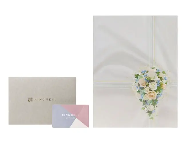 つややかなえんじ色の和紙に梅模様を散らし、リボンとあわじ結びの水引きをかたどったデザイン。就職や開店・創業など新たな門出を祝うのに適しています。 - ローズブーケ プレゼンテージビオラ – 価格: 9,350円(税込)