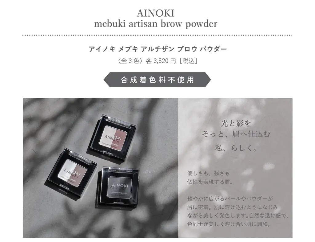 ジャプロ株式会社の新ブランド「AINOKI」から登場するアイブロウペンシルとアイブロウパウダーは、オーガニック成分を使用した肌に優しい製品です。以下の表に、製品の特徴をまとめました。