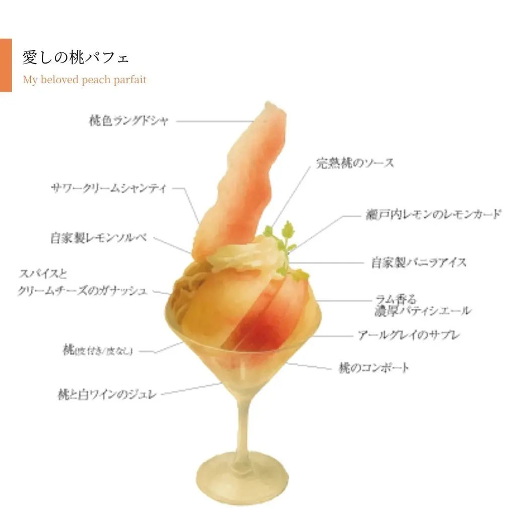 この時期にしか味わえない大玉の桃を贅沢にまるごと1玉以上使用した「愛しの桃パフェ」。このパフェでは、フレッシュな桃、コンポート、皮付きのフレッシュ桃の3種を食べ比べることができ、桃の香りと甘さのグラデーションを楽しむことができます。