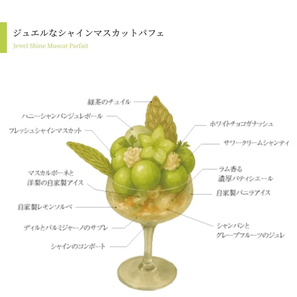 | ジュエルなシャインマスカットパフェ | 3,600円 | 初夏のシャインマスカットを使用し、季節による味の移ろいを楽しめる |