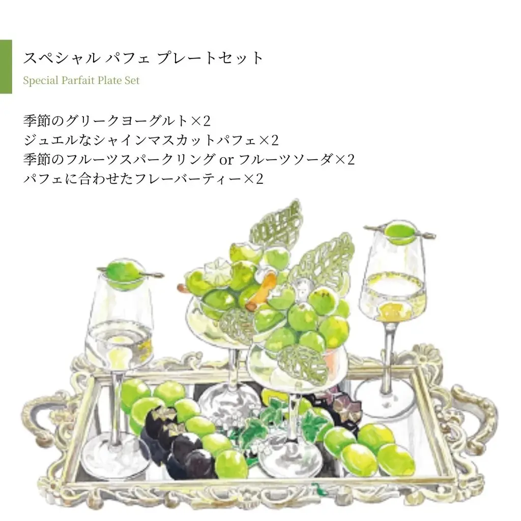 さらに、贅沢なパフェタイムを楽しみたい方には「スペシャル パフェ プレートセット」をおすすめします。このセットは、ジュエルなシャインマスカットパフェMIX Ver.を中心に、季節ごとに変わるパフェを2名様分、ミラープレートにのせて提供します。また、ヨーグルトやドリンク、紅茶もセットになった内容で、特別なひとときや大切な方とのティータイムにぴったりです。価格は9,300円(税込)です。