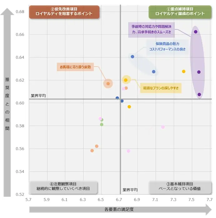| ロイヤルティの要因 | 保険商品の魅力、コストパフォーマンス、事故時の対応力 |