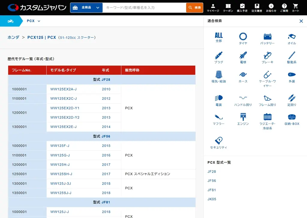 特に、独自開発の検索システムやバイク諸元データと部品適合情報を統合した「バイク適合部品検索」機能を搭載し、より正確かつスピーディに必要な部品を見つけられる環境を整えてまいりました。このシステムは、モデル名・タイプ・年式から適合部品を検索できるもので、整備士の業務効率を大幅に向上させています。