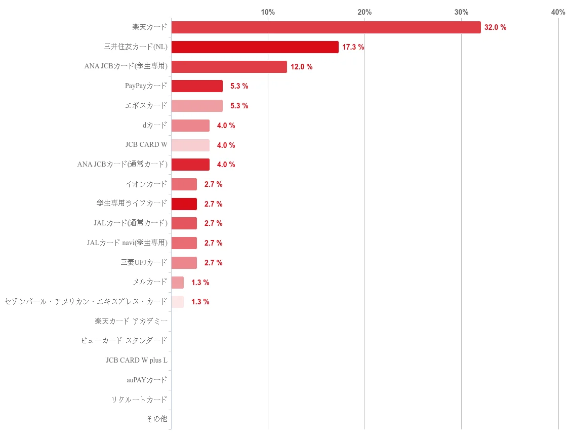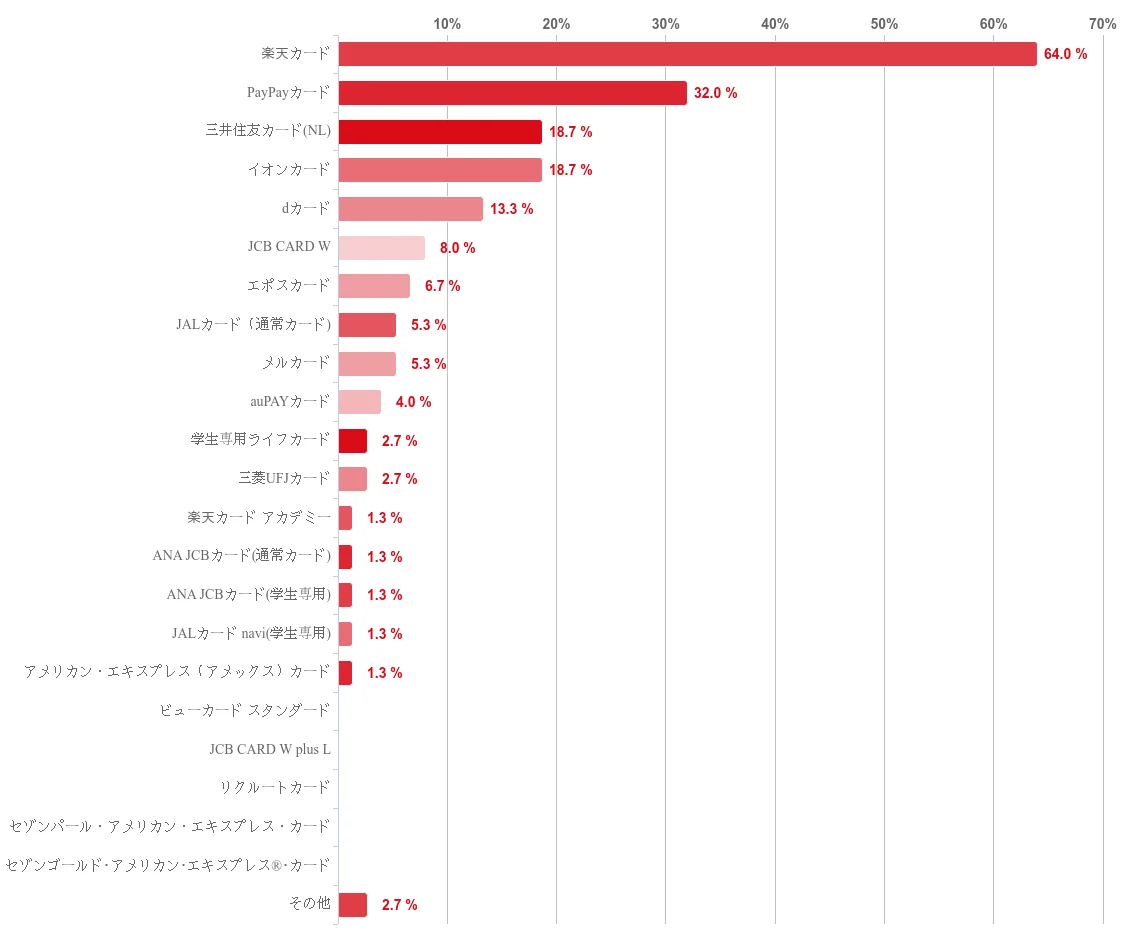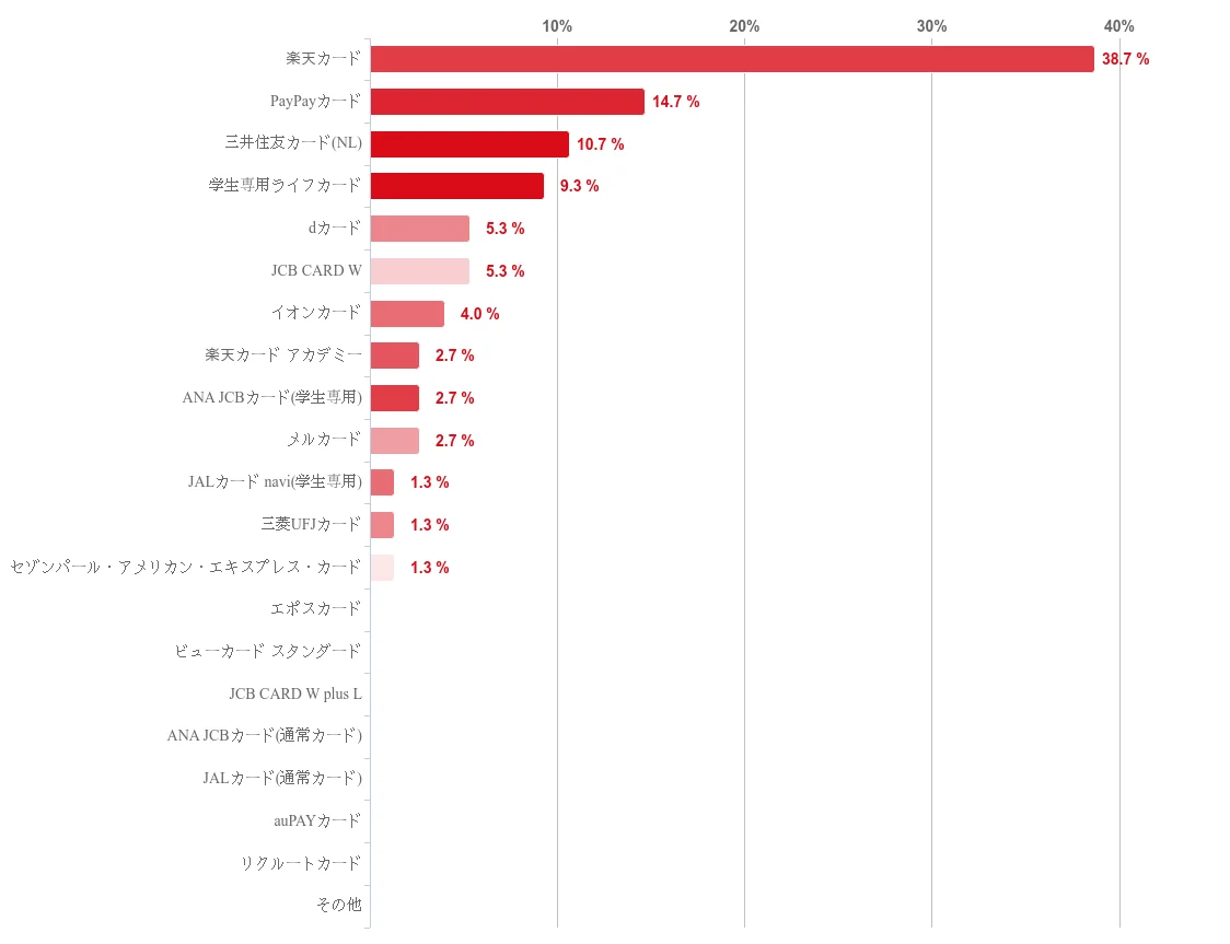 楽天カードが突出しており、学生の保有カードとして広く選ばれていることが確認できます。PayPayカードも一定の支持を集めています。