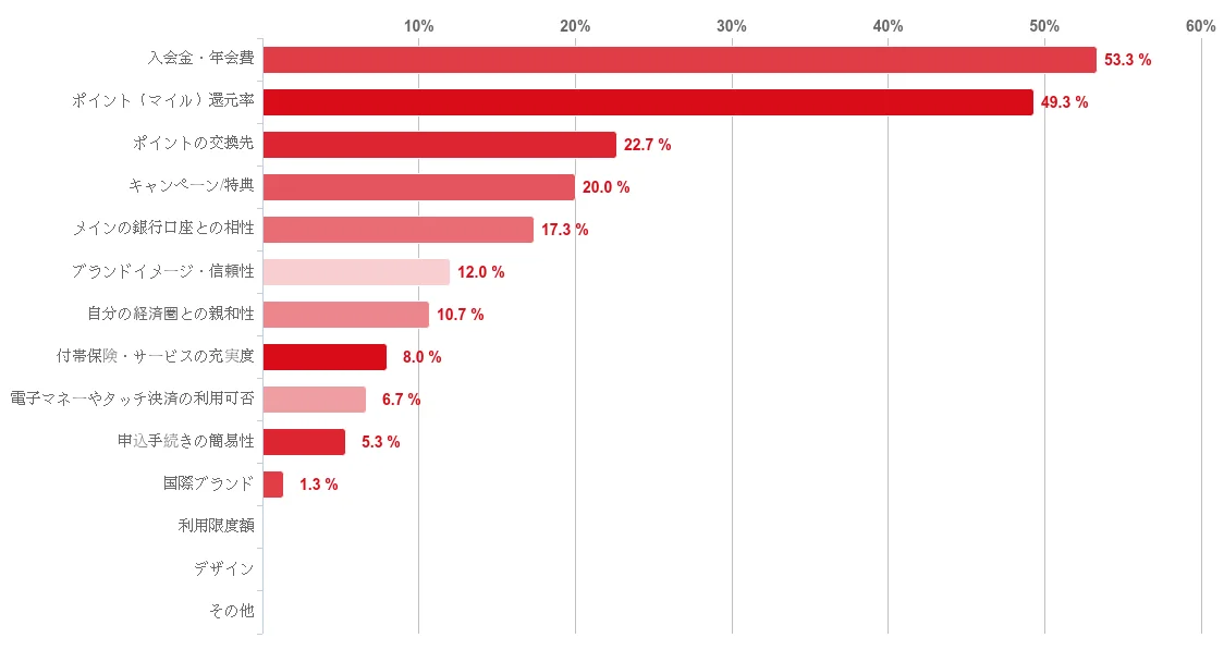 最終的に、カード選択時に学生が重視する点としては、入会金・年会費、ポイント(マイル)還元率、ポイントの交換先、キャンペーン・特典などが挙がっており、コストと還元の両面が判断基準になっていることが示唆されています。