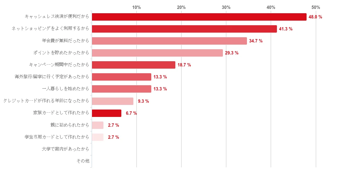 | カードを作ったきっかけ(上位) | キャッシュレスの利便性:48.0% / ネットショッピング:41.3% / 年会費無料:34.7% |
