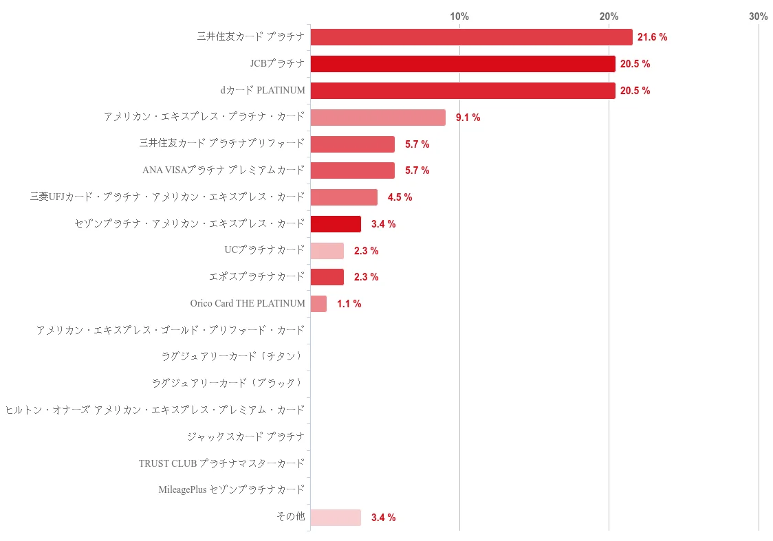 - 海外旅行向け:アメリカン・エキスプレス・プラチナ・カード(21.6%)/三井住友カード プラチナ(14.8%)/JCBプラチナ・ANA VISAプラチナ プレミアムカード(各13.6%)