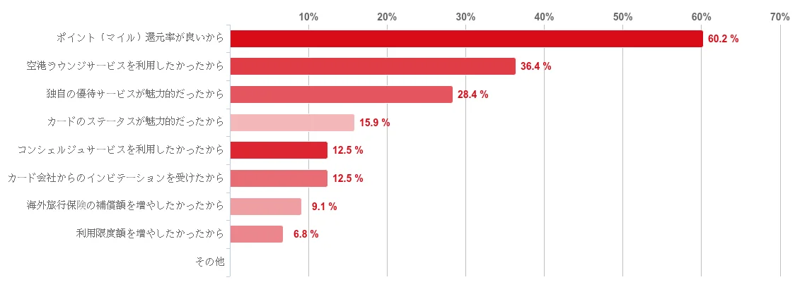 | カード作成の主なきっかけ | ポイント(マイル)還元率が良いから:60.2% / 空港ラウンジ:36.4% / 独自優待:28.4% |