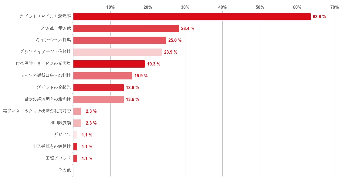 | カード選定で重視する点 | ポイント(マイル)還元率:63.6% / 入会費・年会費 / キャンペーン/特典 |