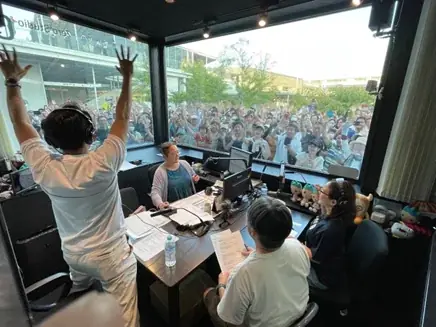 夕方には新山口駅前のZero StudioにてFM山口『COZINESS』へ生出演しました。会場には約300人のリスナーが来場し、放送後のふれあいタイムでは安部礼司と安部優が一人ひとりにステッカーを手渡しました。生出演の様子や交流の詳細は放送やPodcastで確認できます。