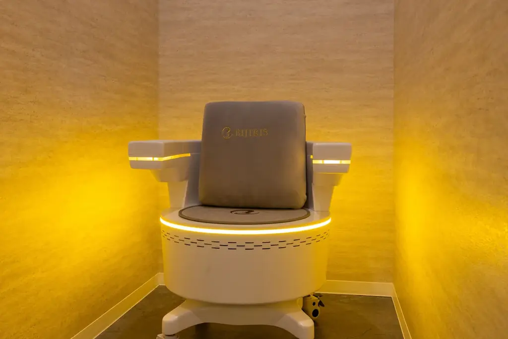 FIT-CHAIRは服を着たまま座るだけで電磁パルスにより骨盤底筋や下半身にアプローチする美容・トレーニング機器です。自分で鍛えにくい部位に対して、筋肉と脂肪の両面から刺激を与える設計です。