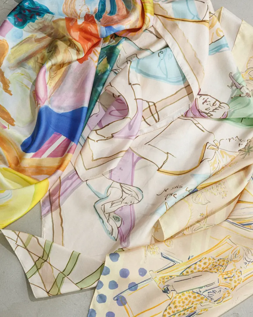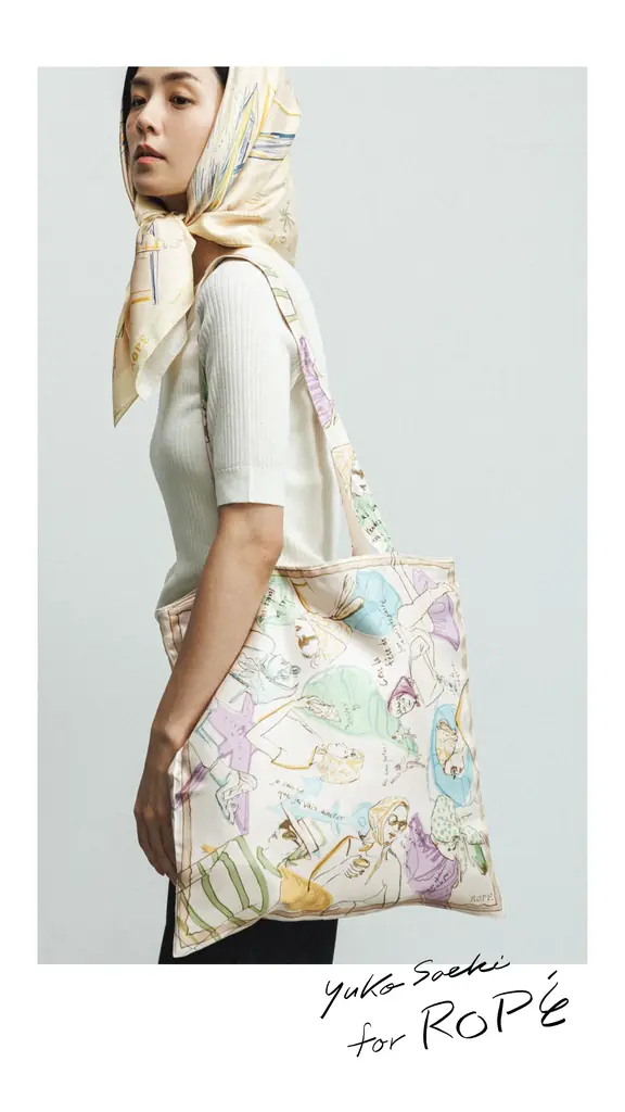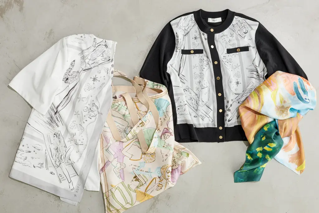 本コレクションでは、佐伯ゆう子氏がROPE’のために描き下ろしたスカーフ柄やサントロペの女性たちのドローイングが、各アイテムの中心的なモチーフになっています。素材感とデザインのバランスを重視し、日常に溶け込むよう工夫されたラインナップです。