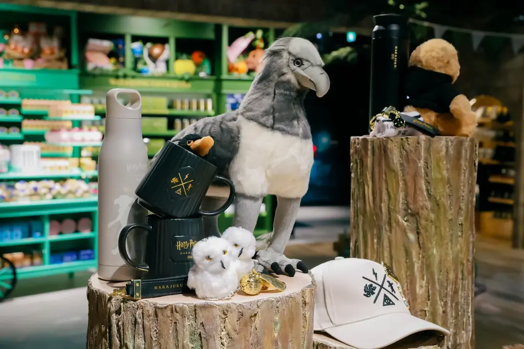 ショップの入口からは大きな木々やフクロウたちが迎え、深い森へと分け入るような演出が施されています。店内には映画『ハリー・ポッターとアズカバンの囚人』に登場するヒッポグリフのバックビークをはじめ、木の幹に佇む魔法動物や羽のディテールまで再現された展示があり、来店者は視覚的にも感触的にも魔法ワールドの世界観に没入できます。