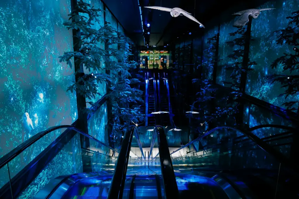 エスカレーターは1階から2階へと続き、頭上の演出や壁面イラストなど細部にわたり世界観演出が施されています。
