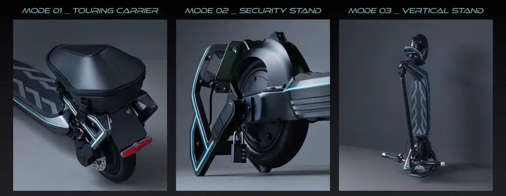 - MODE02_セキュリティスタンド:リアホイールをリフトアップして接地させない構造により、駐車時の盗難抑止を図るモード。盗難防止を完全に保証するものではなく、チェーンロック等との併用が推奨されています。