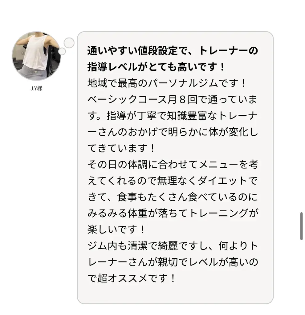 O様:フォーム改善により怪我なくトレーニングが継続でき、スクワットは30kg前後から70kg前後へ向上。予約変更の柔軟さも評価されています。