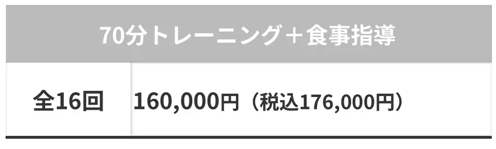 | 短期集中コース | 栄養指導(アプリ・写真)付き、リバウンドアフターサポートあり。有効期限4ヶ月 |