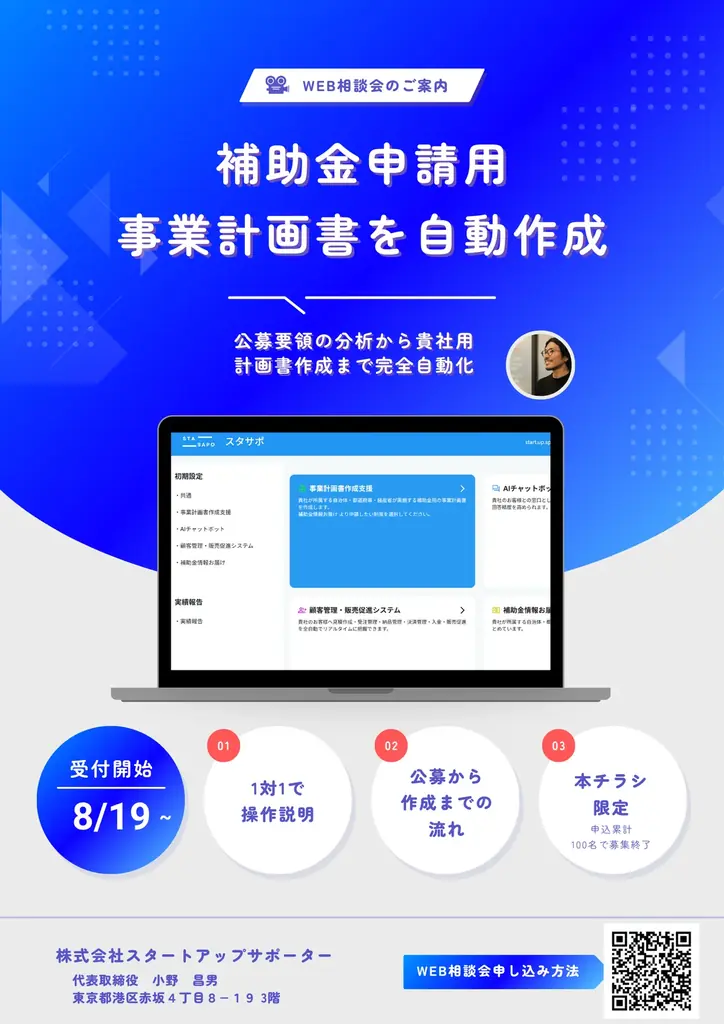 2025年8月15日 18時27分に発表されたプレスリリースによると、株式会社スタートアップサポーター(本社:東京都港区、代表取締役:小野 昌男)が提供する補助金申請用事業計画書自動作成サービス「スタサポ(STA\\SAPO)」が、IT導入補助金2025の対象ITツールとして認定されました。