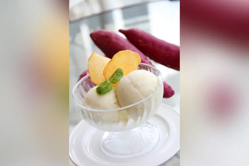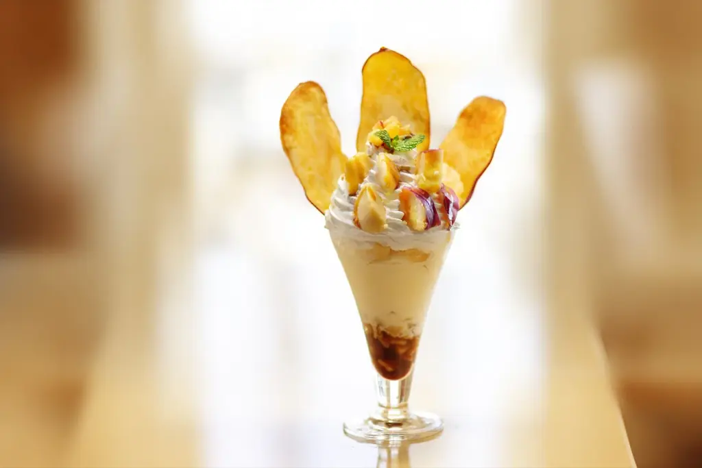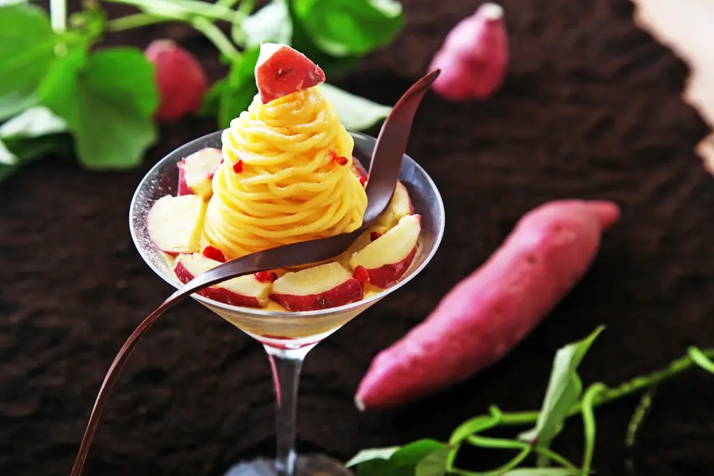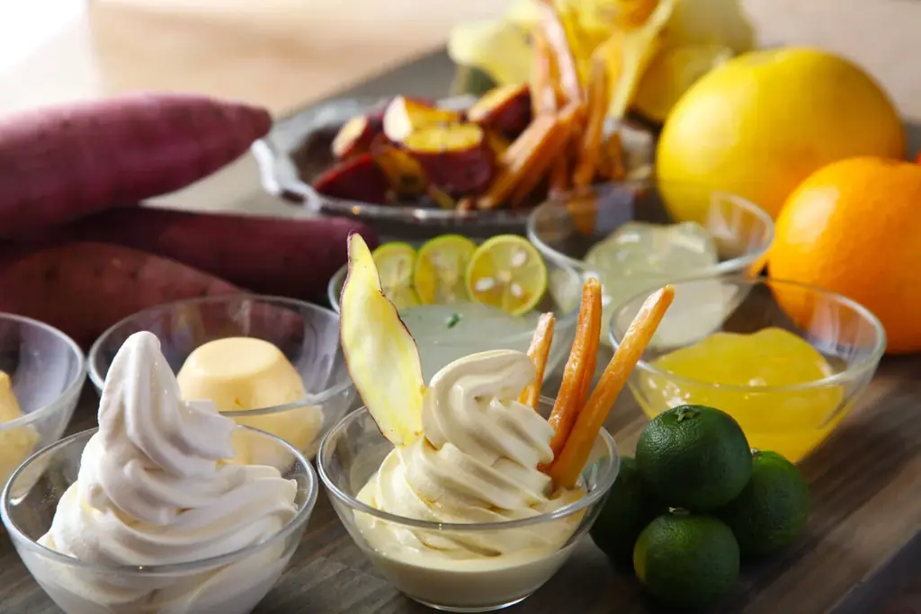 ホテル内ではなると金時を用いた多彩な料理やスイーツを提供しています。天ぷらや大学芋、焼き芋といった定番のほか、パフェやタルト、スムージー、クリームブリュレなどスイーツ類も充実しており、レストランやカフェごとに特色あるメニューが揃います。