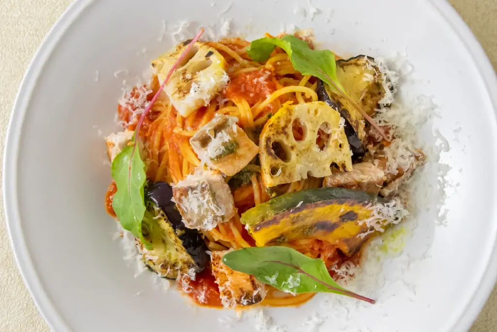 秋鮭と旬野菜ローストのトマトソースパスタは、1628円(税込)で提供されます。このパスタは、旬の秋鮭を大胆に使い、彩り豊かな旬野菜をごろごろと配したトマトソースが持ち味です。