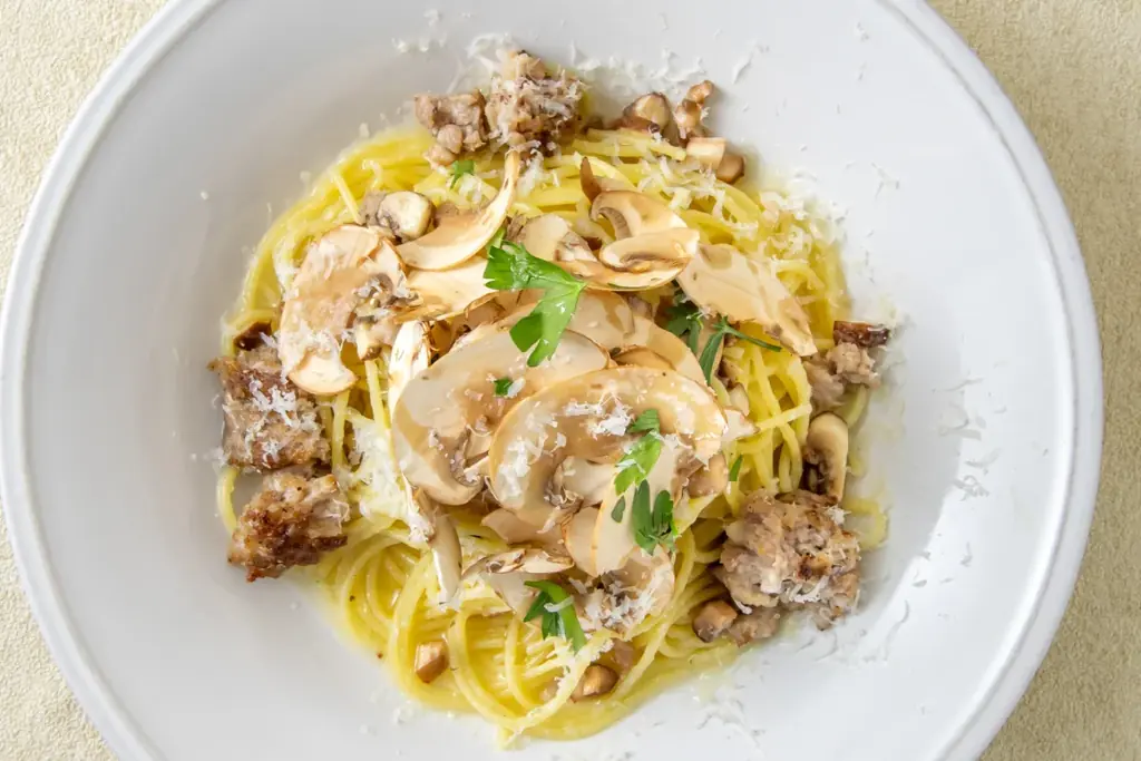 サルシッチャと六甲マッシュルームのオイルパスタは、1496円(税込)で、オイルベースのパスタとして仕上げられています。サルシッチャは香ばしく焼き上げられ、ジューシーな旨みがオイルソースに溶け出す設計です。