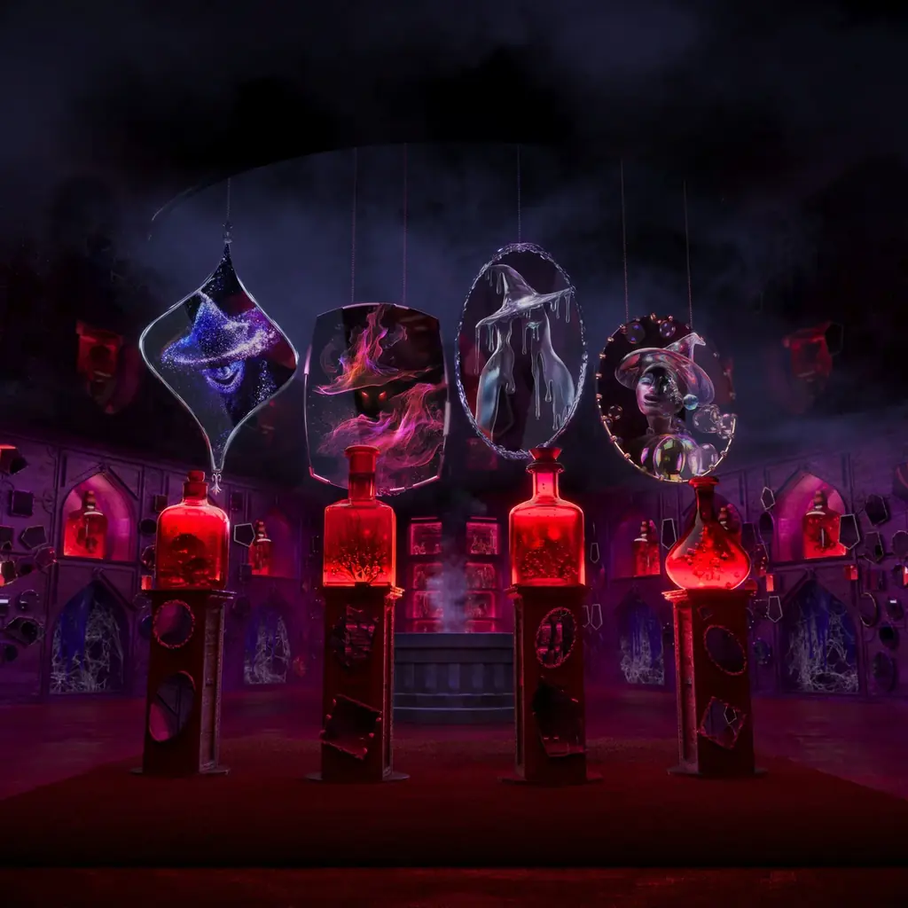 KATEとユニバーサル・スタジオ・ジャパンが共鳴して誕生したアトラクションは、パーク側がオフィシャル・イベント・パートナーとアトラクションを共創するという点で、パーク史上初の試みとなります。本アトラクションは、鏡が配された独特の空間で「感情を司る4人の魔女」が来場者を迎えます。