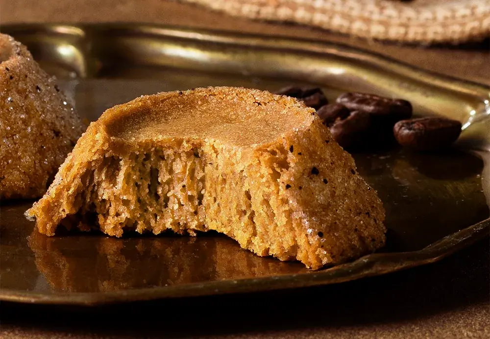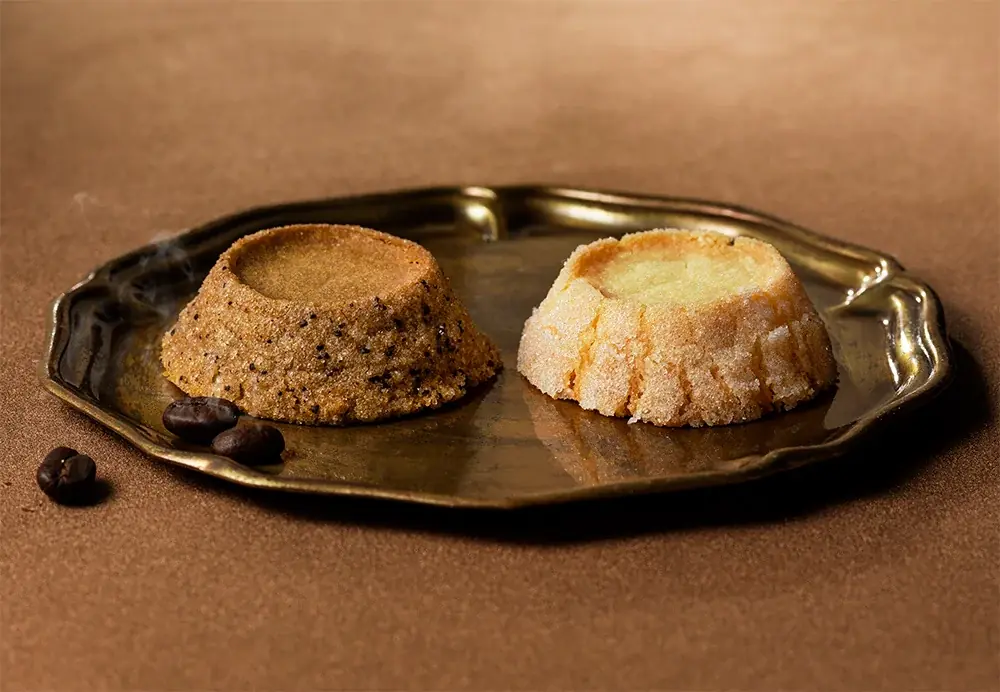 バター含有率33%のリッチなバター感と三本珈琲のほろ苦い珈琲風味を両立。外層に細挽きブラジル豆入りシュガーを使い、サクッと香る珈琲ととろけるバターが特徴です。