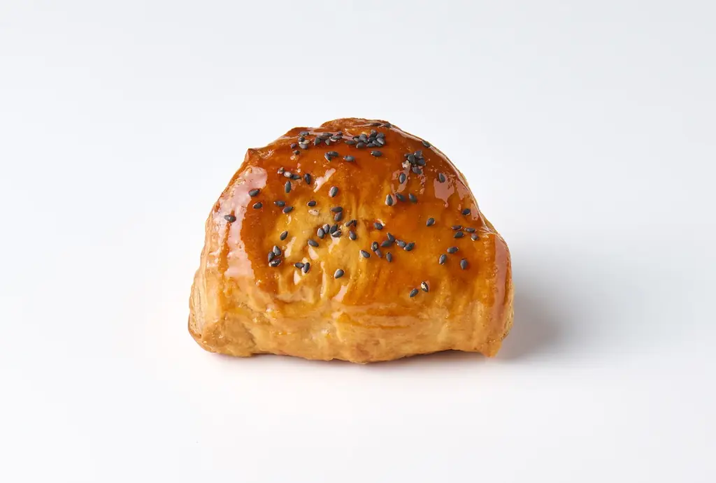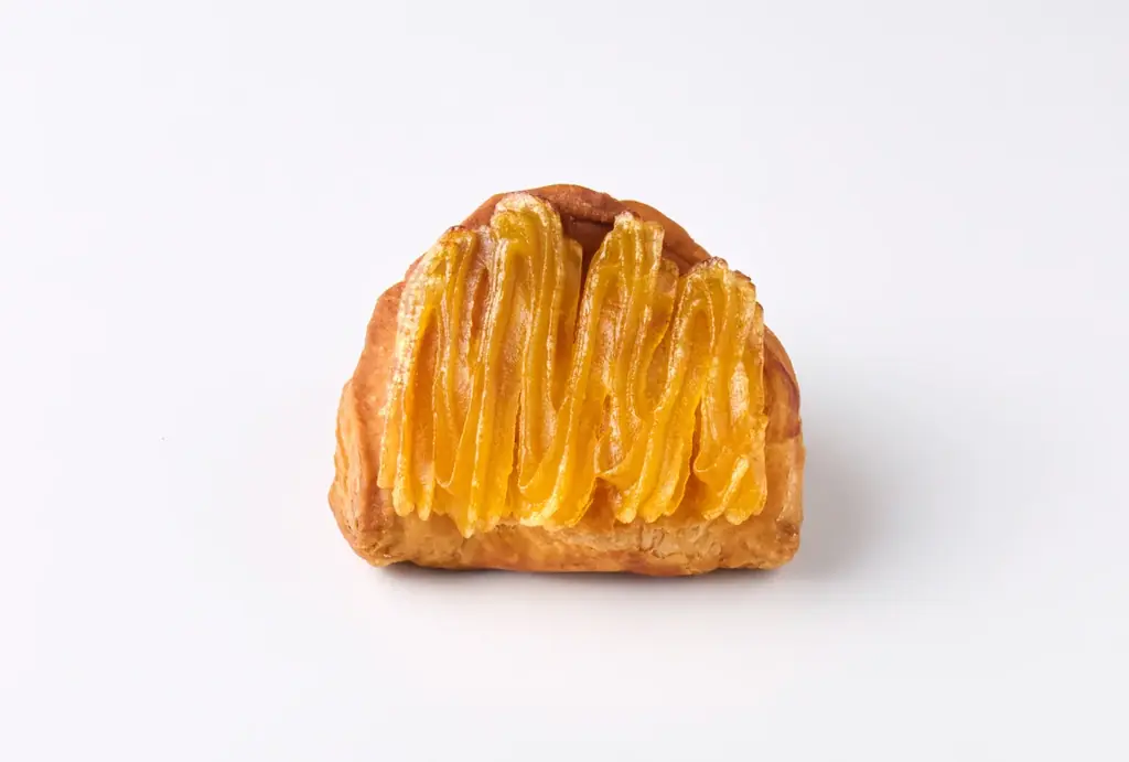 - カスタードクリーム入りの紫いもあんペーストをたっぷり絞り、蜜漬けりんごとミルキーなカスタードと調和させた上品な味わい。サクサクとしっとりの食感が対比する一品。