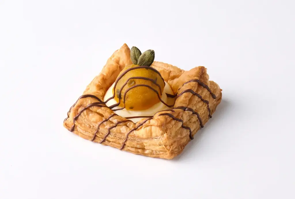 - 729層のサクサク生地にサワークリームチーズ合わせのカスタード、ドーム状のかぼちゃ餡をのせた濃厚な味わい。