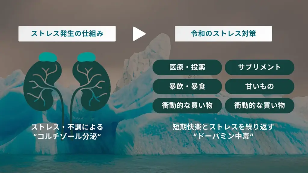 プレスリリースでは現代社会の課題として「ドーパミン中毒」を指摘しています。ストレスや体調不良が引き金となり、副腎からストレスホルモンであるコルチゾールが分泌されると、意欲低下、免疫力の低下、体脂肪の蓄積、睡眠の質低下といった負の連鎖が生じる点が説明されています。