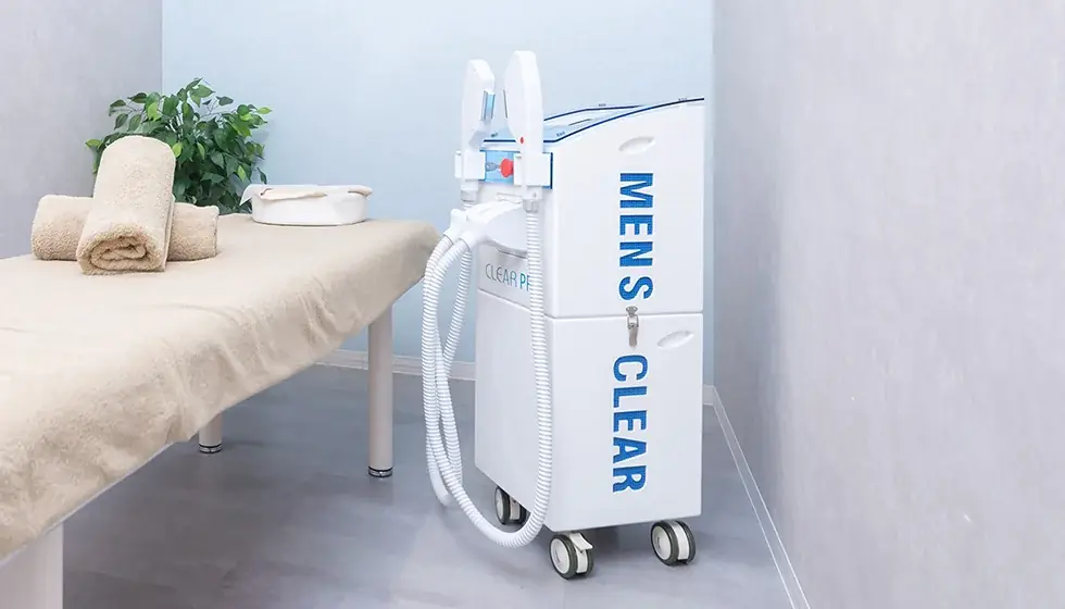 メンズクリアが採用する脱毛機「クリアプロ」は、IPL(熱破壊式)とSHR(蓄熱式)を掛け合わせたハイブリッド脱毛機です。照射面には光を効率的に通すクリスタル・サファイアを用い、肌に接する部分をマイナス4度まで冷却する機構を備えることで、照射時の熱を緩和し痛みの軽減を図っています。