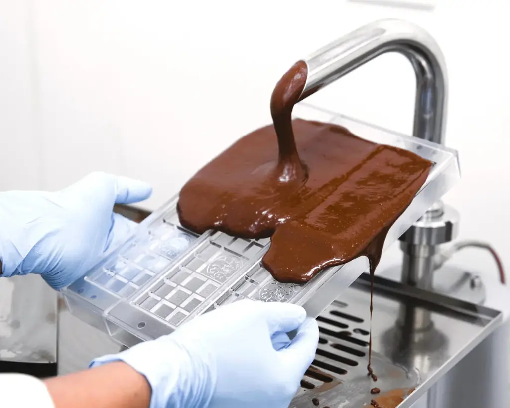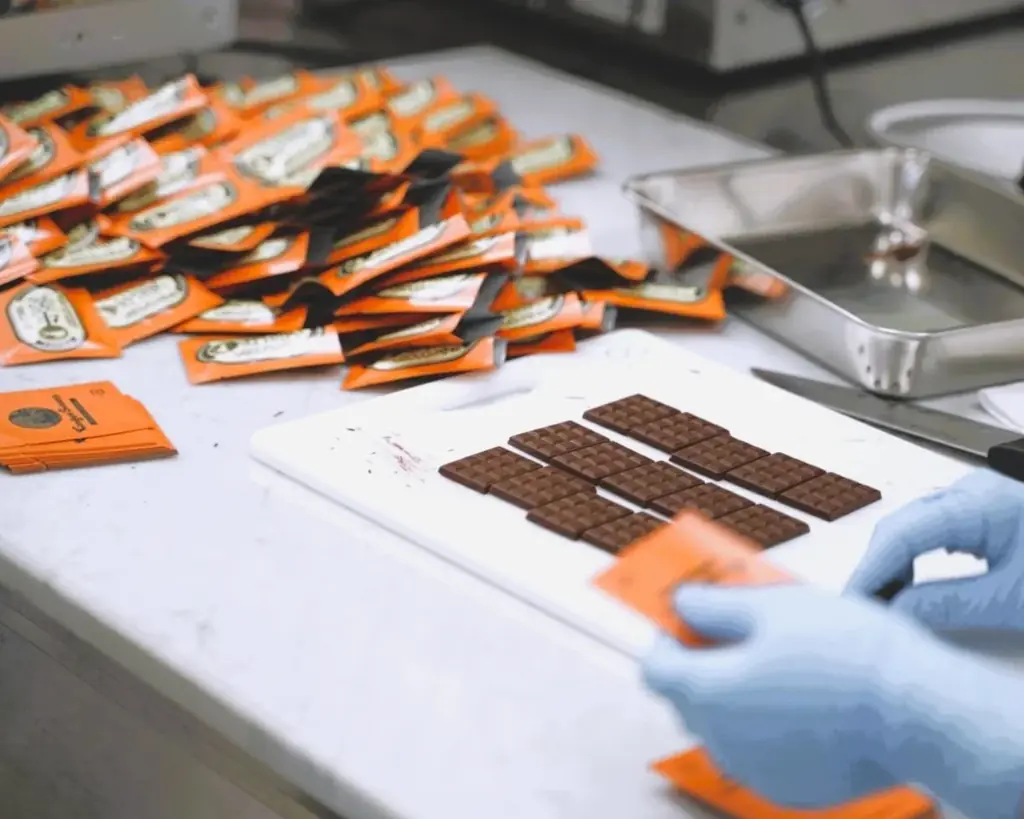 手作りのタブレット(BEAN TO BAR)として、一枚ずつ丁寧に仕上げられる。焙煎・配合・成形の工程に職人の目配りがある。