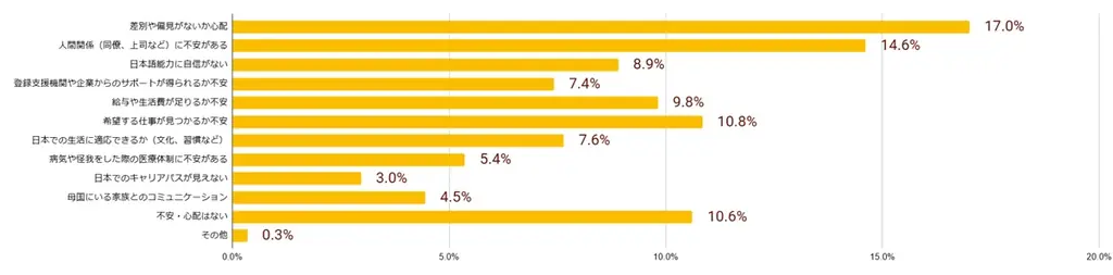 | 最大の不安(差別・偏見) | 特定技能:18.0%、技能実習:17.0% |