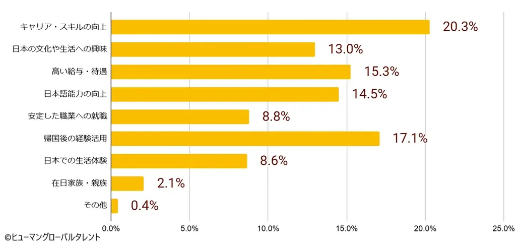 調査結果からは、インドネシアの学生たちに強い「学習意欲」と「長期的なキャリア志向」が共通して見られました。日本での就労理由としては「キャリア・スキルの向上」が最大であり、日本での経験を通じた自己成長を重視する傾向が確認されています。