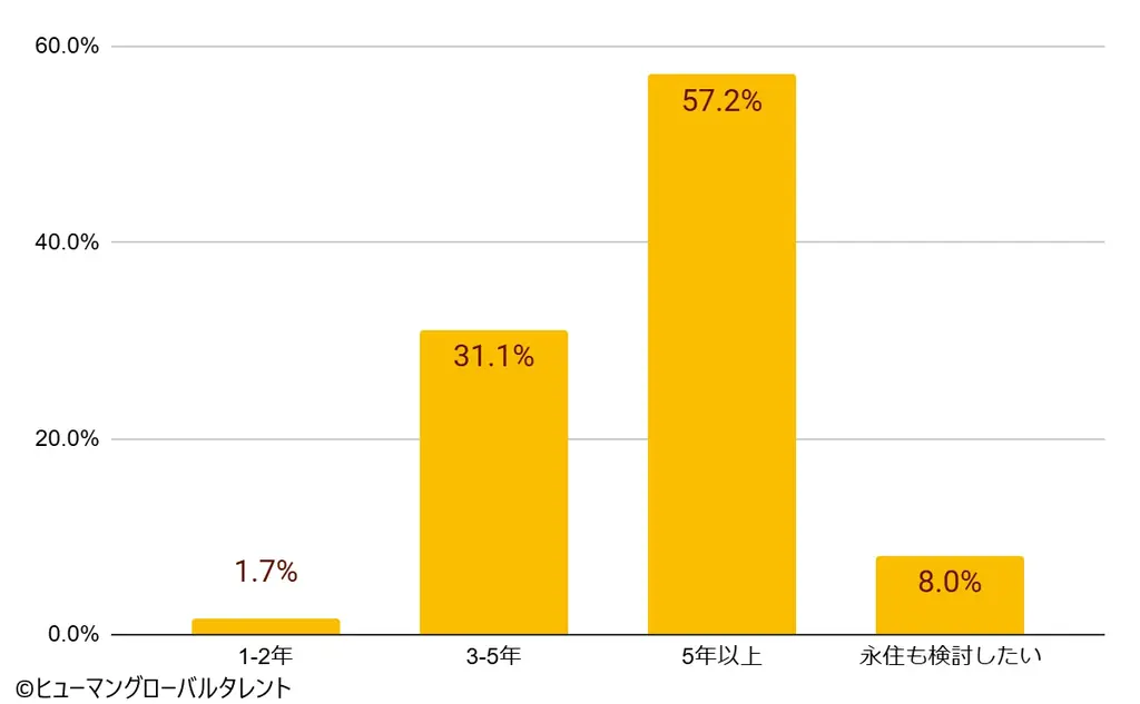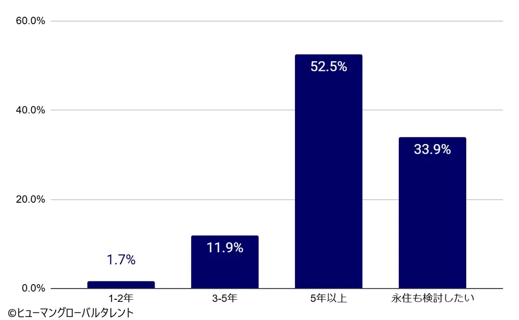 希望就労期間では、両クラスとも「5年以上」を希望する回答が過半数を占めました。具体的には、特定技能で52.5%、技能実習で57.2%が「5年以上」を希望しています。