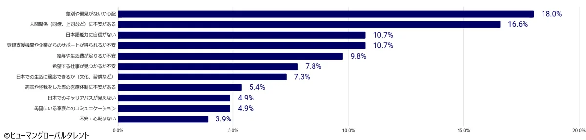 両クラス共通で最大の不安は「差別や偏見への懸念」で、特定技能が18.0%、技能実習が17.0%でした。次いで「人間関係に不安がある」が特定技能16.6%、技能実習14.6%と続いています。