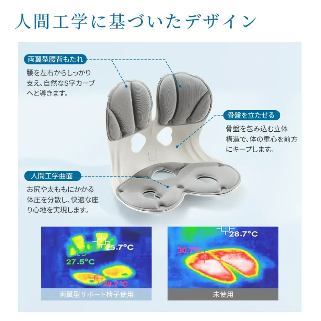 両翼設計で背もたれが体にフィットし、骨盤後傾や腰椎後弯化を防止する効果を目指しています。専門家の関与により、安心して日常に取り入れられる信頼性を確保しています。