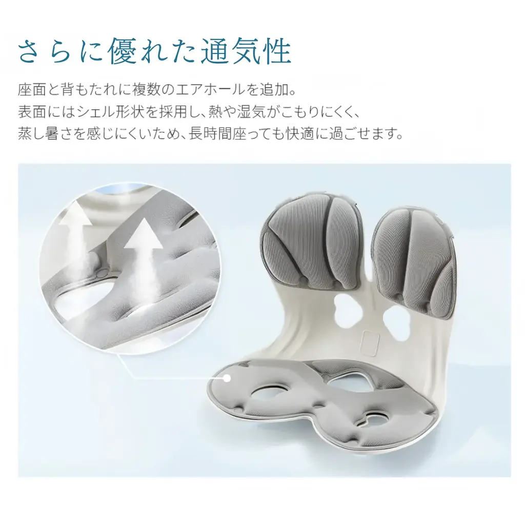 本製品は座るだけで骨盤を理想的な角度に導き、背筋を自然に伸ばす設計を採用しています。長時間座っても疲れにくい構造と、取り外し可能なカバーなど日常の利便性を高める改良がなされています。