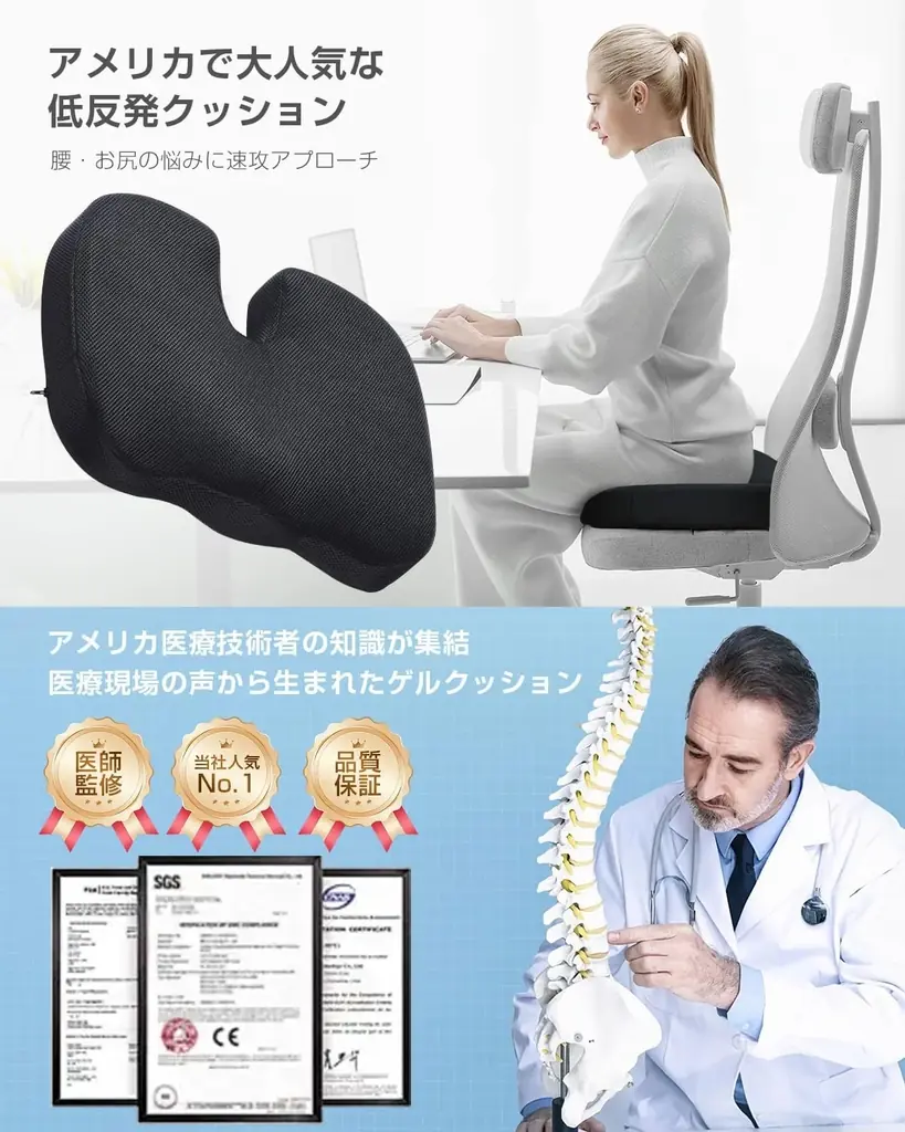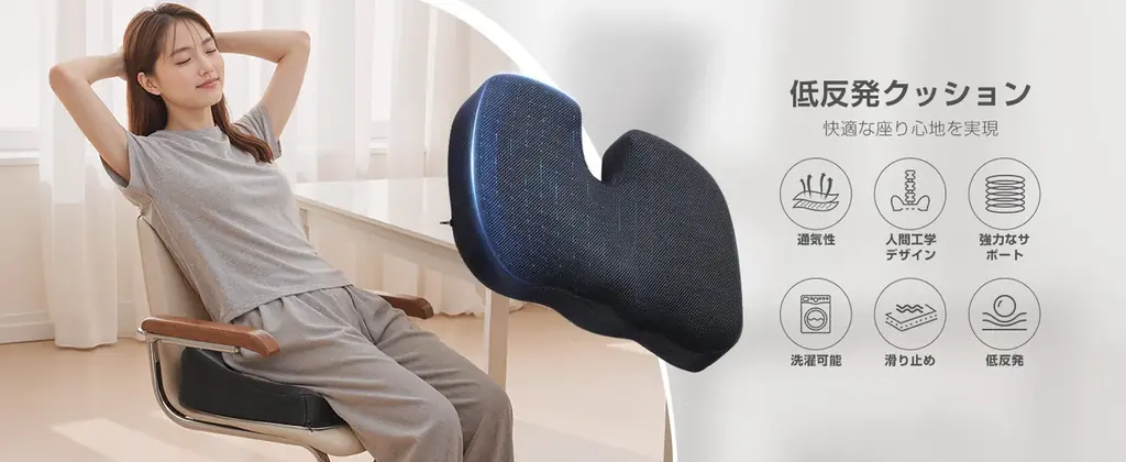 | Z01 クッション | 米国医学博士監修、低反発ウレタン、U形デザイン、カバー着脱丸洗い可能、通気性メッシュ、滑り止め底面 | 多用途クッション(詳細は製品ページ) | オフィスチェア、車、フロアクッション、長時間座位 | https://www.amazon.co.jp/dp/B0FDKN9Y8C |