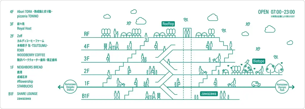 - オープンエアのアウトモール:駒沢公園へと繋がる緑豊かな道のような空間を創出し、まちの回遊性を高める設計。
