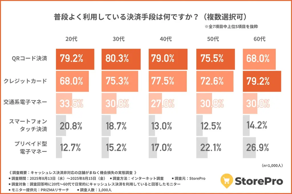 StorePro(所在地:東京都港区)が実施した調査は、日常的にキャッシュレス決済を利用している20代〜60代の消費者を対象に、キャッシュレス決済に非対応の店舗がもたらす機会損失の実態を明らかにすることを目的としています。調査は2025年8月13日(水)〜2025年8月15日(金)にかけて、PRIZMAによるインターネット調査で行われ、回答者数は1,000人でした。