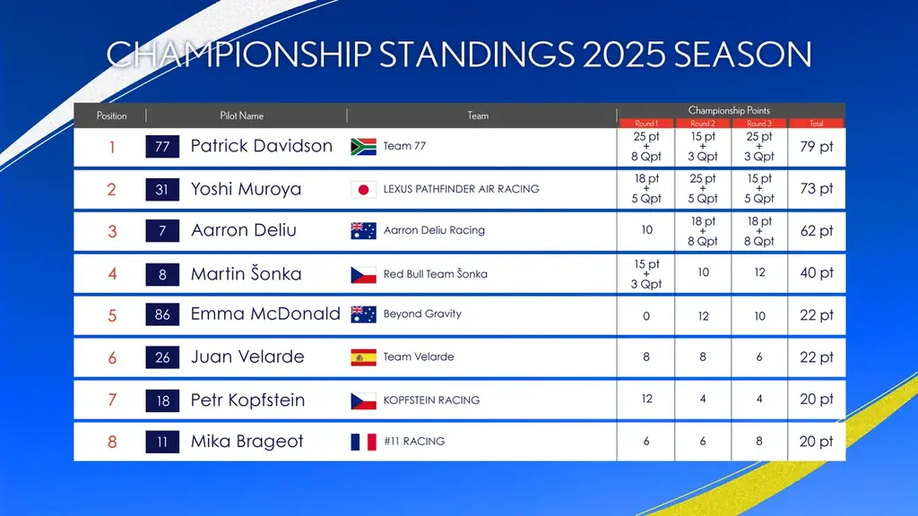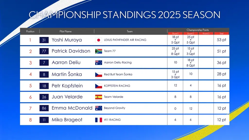 この最終決戦は、シリーズを通じて首位を争ってきた三強――室屋義秀(日本/LEXUS PATHFINDER AIR RACING)、パトリック・デビッドソン(南アフリカ/Team 77)、アーロン・デリュー(オーストラリア/Aarron Deliu Racing)――による緊迫した争いの結末でした。順位は試合のたびに入れ替わり、最終的にパトリック選手が年間79ポイントでトップとなりました。なお、本記事内の成績・所感は主催発表の公式結果に基づいています。