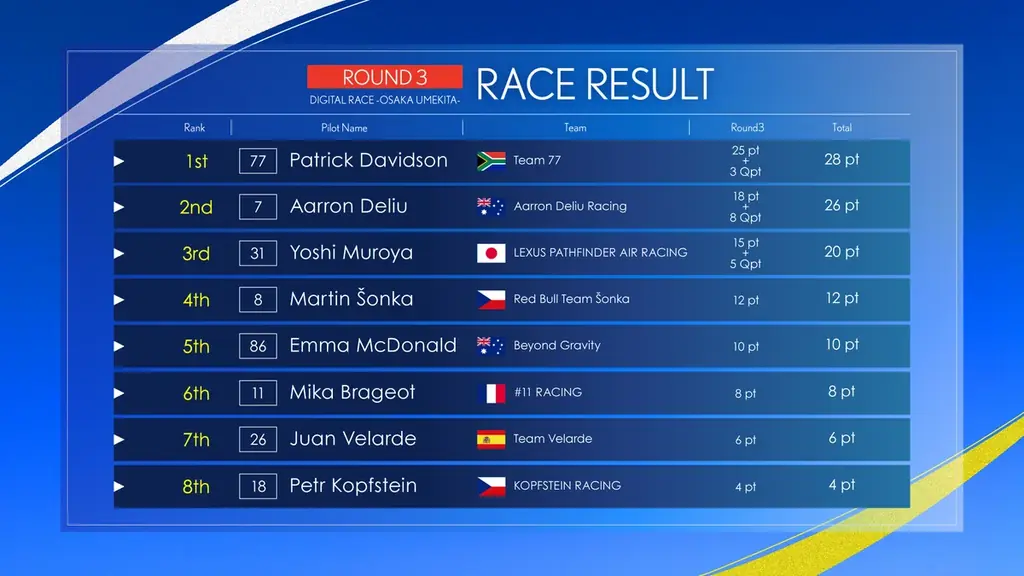 2025年シーズンの最終戦は、9月6日(土)に大阪うめきたで開催され、南アフリカのパトリック・デビッドソン(Team 77)が最終戦優勝を飾り、年間チャンピオンの座に輝きました。決勝トーナメントで宿命のライバルたちとの直接対決を制し、シリーズランキング首位を奪還した形です(発表時刻:2025年9月6日 16時25分、(c) AIR RACE X)。