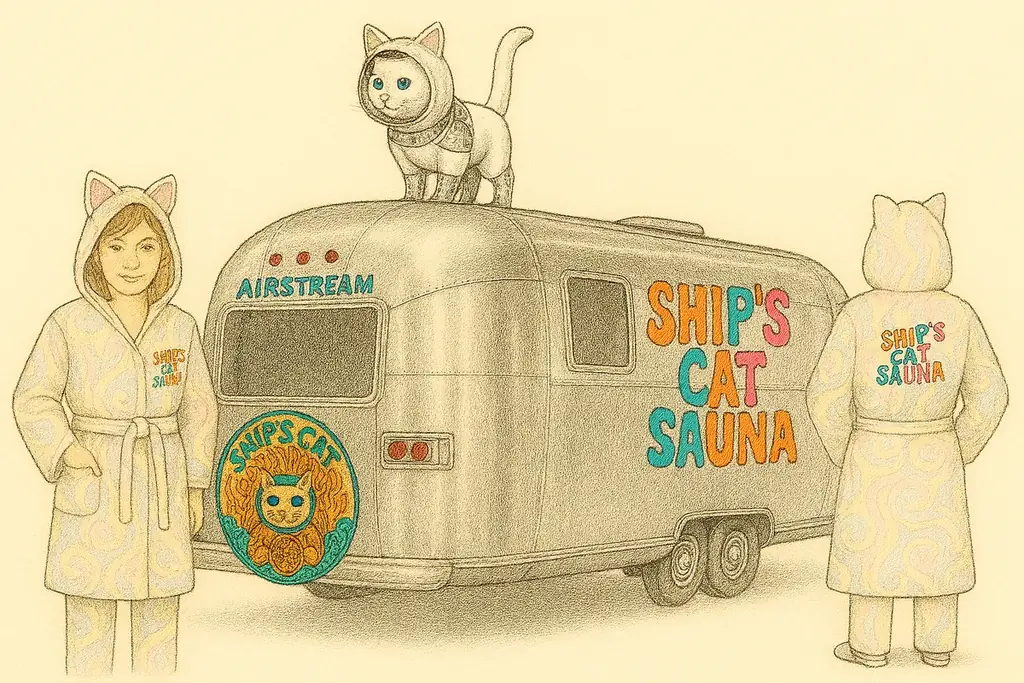 《SHIP’S CAT SAUNA》はキャンピングカー「エアストリーム」を用いた新作インスタレーションで、内気浴の機能を備えた空間を作り、来場者は宇宙空間を漂うような内気浴体験を得られる設計になっている。タカラスタンダード株式会社の協力により、昭和レトロな《SHIP’S CAT》のホーロー看板をエアストリームに展示し、北加賀屋のまちなかにも同デザインの看板が掲示される。